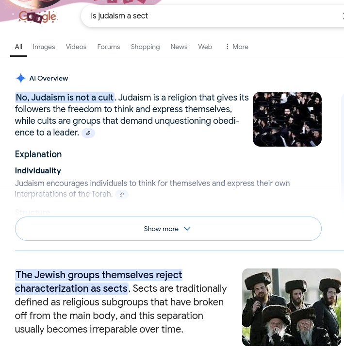 Google AI has reviewed the entirety of available literature on religious history, definitions of terms like sect, among many other things. It should not be trusted completely, but it's a good way to enter into a line of research. Google and services like it can be the pathway to, but they are not the destination of, enlightenment.