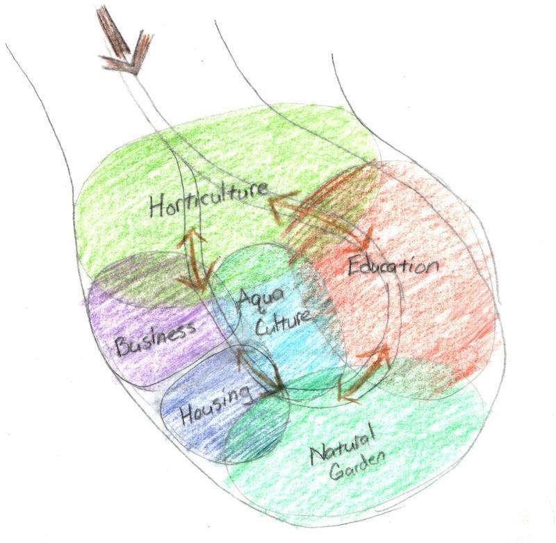 The two respective sites can be strategically aligned through the sites' intended and planned uses: horticulture, aquaculture, education, business, housing, and garden.